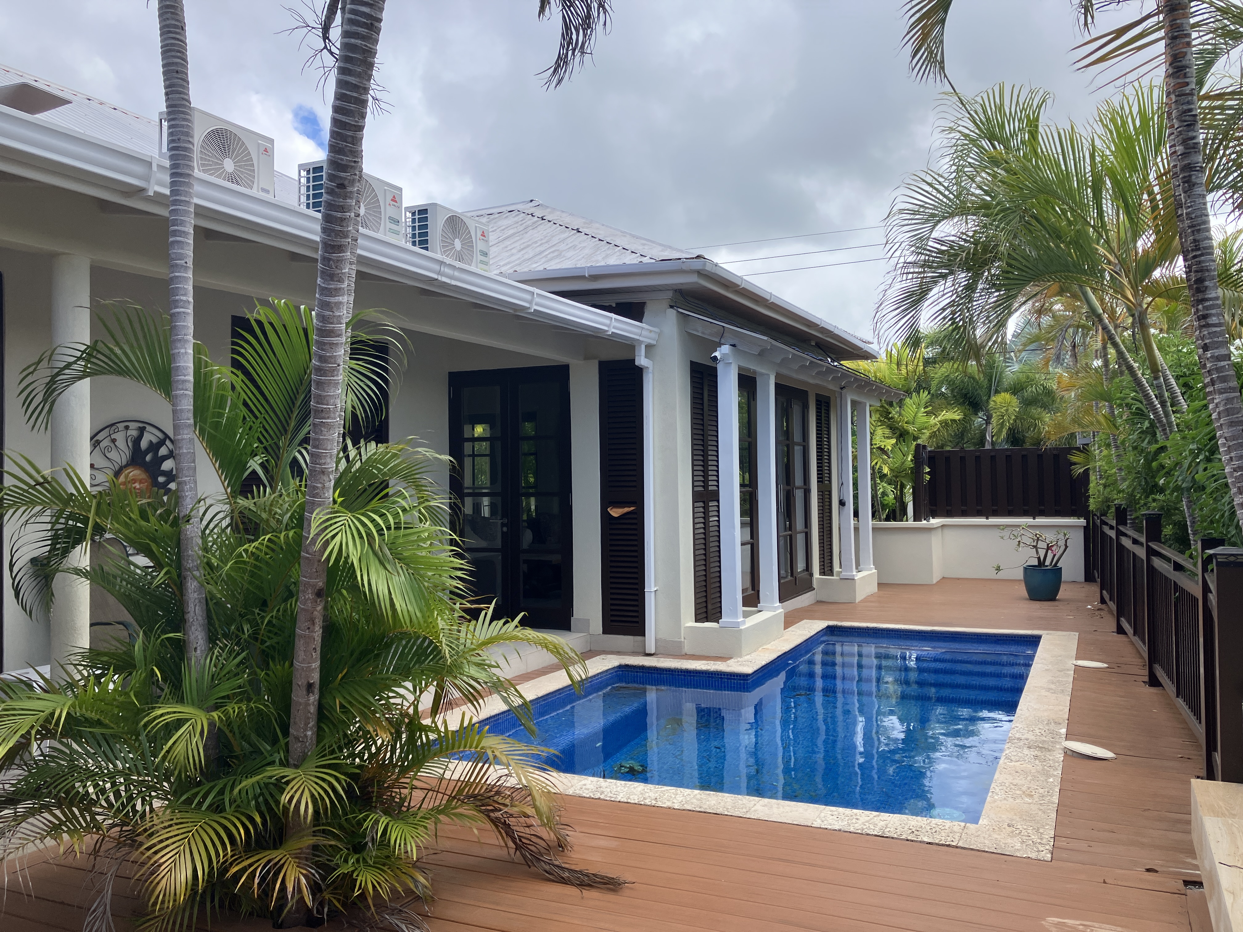 The expansive deck area is a tranquil retreat, complete with a pool, soothing water feature, bar area and palm trees dotted around, creating a serene ambiance perfect for relaxation and entertaining. The living area and two of the bedrooms open onto this idyllic space through beautiful French doors providing seamless transitions between indoors and outdoors.